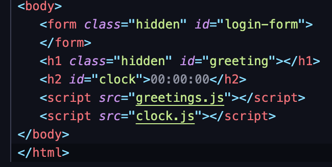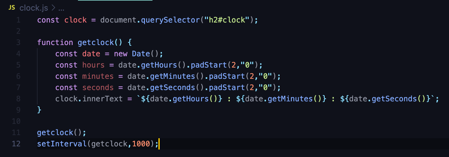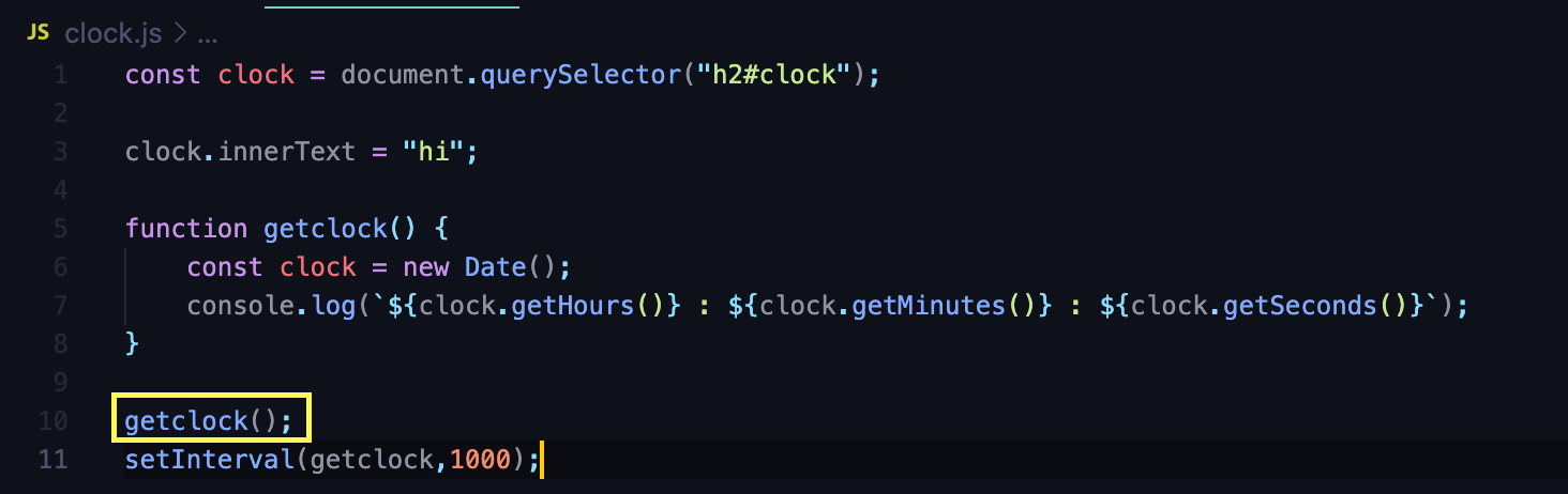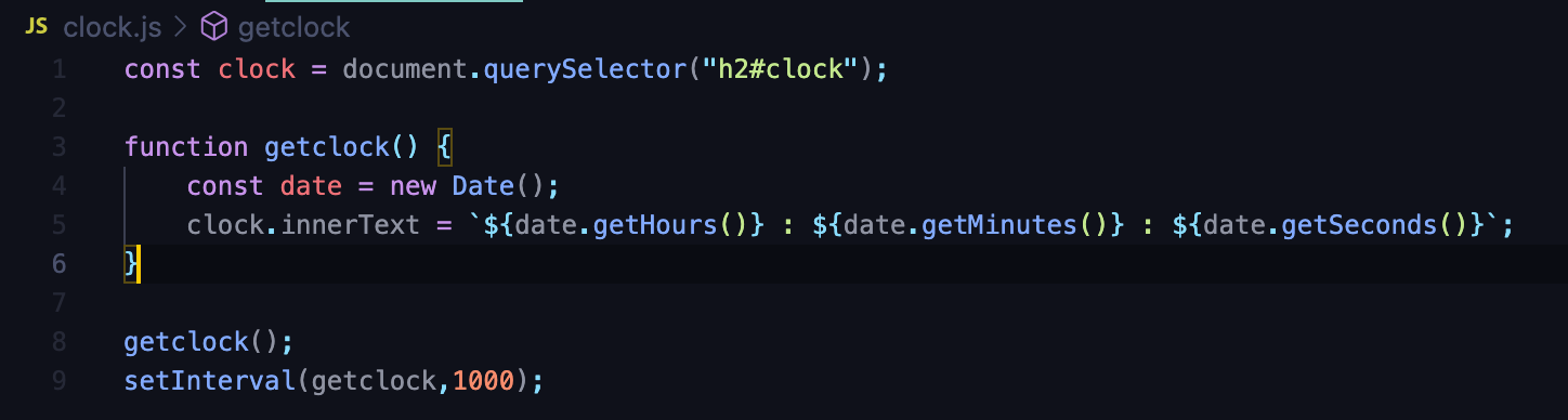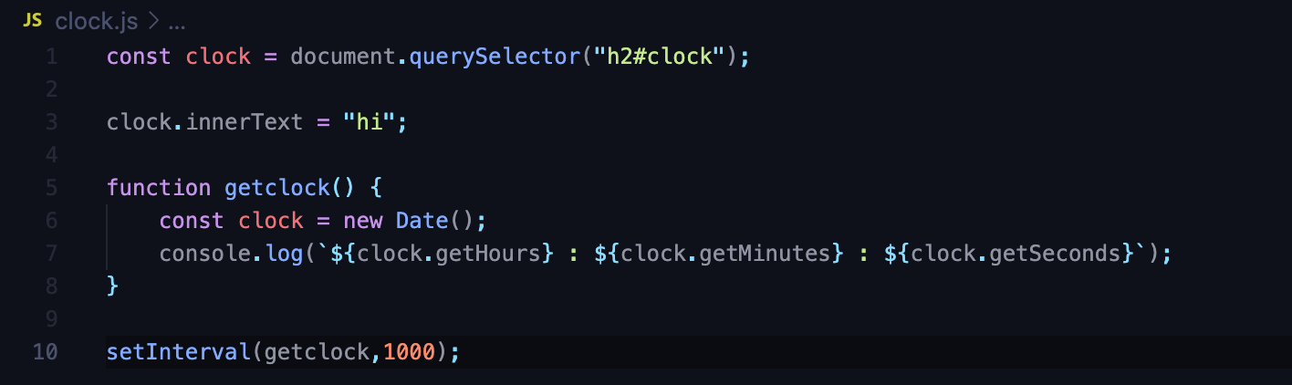 (์ฐธ๊ณ ๋ก HTML๊ฐ์ ๋ฐ๋ const clock์์์ clock๊ณผ function์์ new Date() ๊ฐ์ ๋ฐ๋ clock์ด ์ด๋ฆ์ด ๊ณ์ณ์ date๋ก ๋ฐ๊ฟ.)