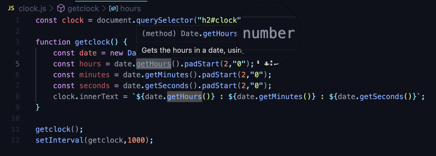 date.getHours, getMinutes, getSeconds ๋ก ๋์จ ๊ฐ์ ๋ชจ๋ Number ๋ผ๋ ์ !