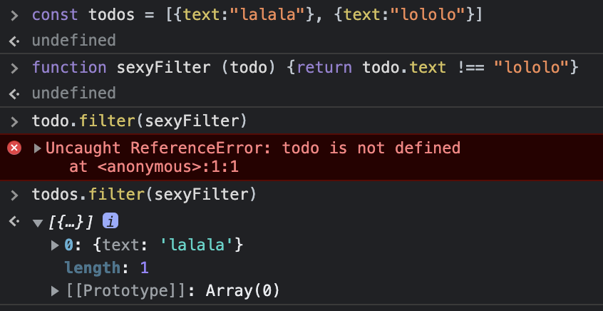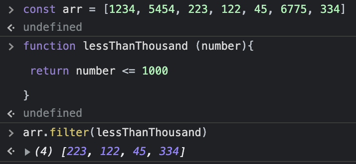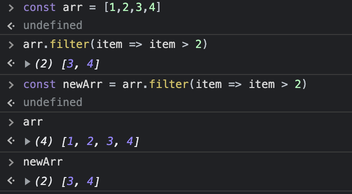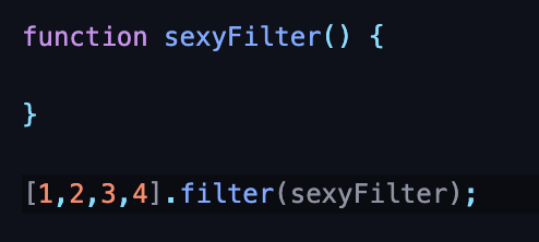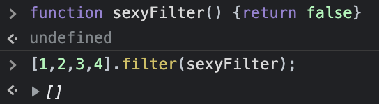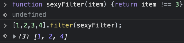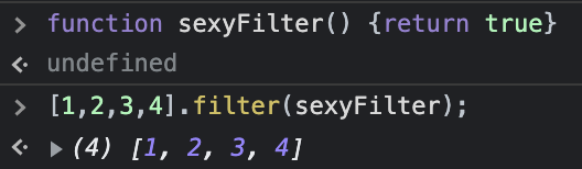 JS가 sexyFilter를 4번 부른다. 매번 숫자는 달라진다.(1,2,3,4) 그리고 sexyFilter함수가 true를 리턴하면 JS는 각각 1,2,3,4 를 유지한다. 그래서 새로 만들어지는 array 안에 1,2,3,4가 있다.